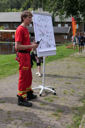 Die Kinder wurden am Samstag mit den bewährten Klängen von "Guten Morgen Sonnenschein" und besten Gewissen der Übungsleiter um 7 Uhr zum Frühschwimmen geweckt. Trotz früher Stunde waren die Kinder schon motiviert, in den See zu gehen. Nach der morgendlichen Sporteinheit und schnellem Abtrocknen ging es erstmal für eine Stärkung für die bevorstehenden Aufgaben zum Frühstück. Diese Aufgaben sollten nun im Stationsbetrieb bewältigt werden, wobei die DLRG-Kinder mit den dazustoßenden Sebnitzer Heimkindern vermischt wurden. Unter den sechs Stationen "Boot", "Schnorcheln", "Erste Hilfe", "Rettungsgeräte", "Funk" und "Schwimmen" wurden die Kinder aufgeteilt und mussten in den folgenden 3 Stunden den Anweisungen ihrer zugeteilten Betreuer Folge leisten. Die Kinder konnten sich im Voraus zwei Stationen ihrer Wahl aussuchen, an denen sie den Tag über Neues gelernt haben. Zwischen den beiden Stationen gab es Mittagessen, um die Energiereserven aufzufüllen. Zwischen den 13:30 Uhr und 14:30 Uhr hieß es für alle Kinder Spielen, Baden, Freizeit, wobei sich die Wasserrutsche nicht vor rutschenden Wasserratten retten konnte. Am Nachmittag ging es weiter mit der zweiten Station und einer kleinen Vesperpause mit leckeren Keksen, Kuchen und erfrischenden Getränken, denn die Sonne strahlte ohne Pause vom Himmel. Nach Beendigung der Stationsarbeit hieß es für alle erstmal trocken werden und eine Stunde Freizeit, wobei uns auch die Sebnitzer Heimkinder wieder glücklich verließen. Zum Abendessen gab es die extra in Dresden bestellten chinesischen Nudeln, die allen richtig gut schmeckten. Zum Abendprogramm konnten die Kinder nach Sternschnuppen Ausschau halten und die Kinder waren begeistert davon, den DLRG-Schriftzug im Hüttenteich mit Fackeln darzustellen - was ihnen sehr gut gelang. Um 22 Uhr sind alle total erschöpft in ihre Betten gefallen.